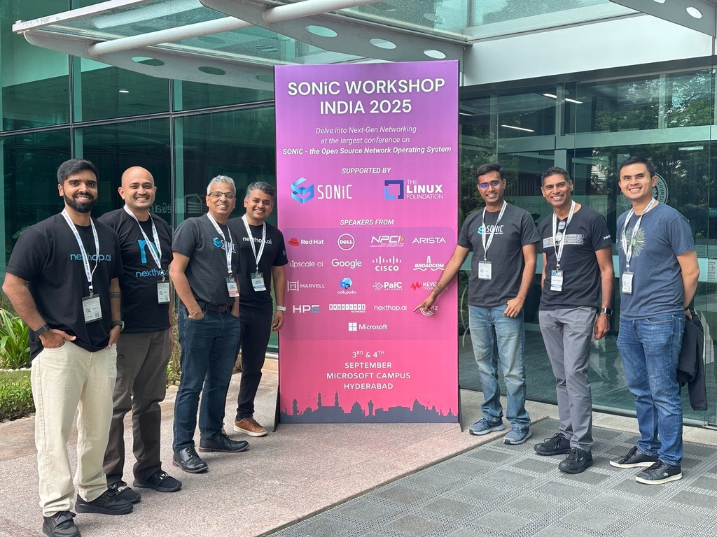 The Nexthop AI team at the SONiC India Workshop in September 2025, held at the Microsoft India Development Center (IDC) in Hyderabad. The author, Ryan, is pictured on the far right.